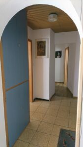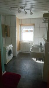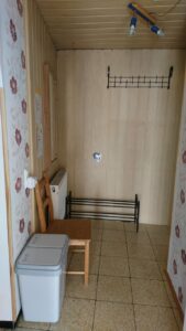 Doppelbett 180×200 cm in Komforthöhe, 7-Zonen Kaltschaummatratzen, verstellbare Lattenroste, Kleiderschrank, Tisch und 2 Stühle. Bettzeug, Bettwäsche und Handtücher siehe oben.